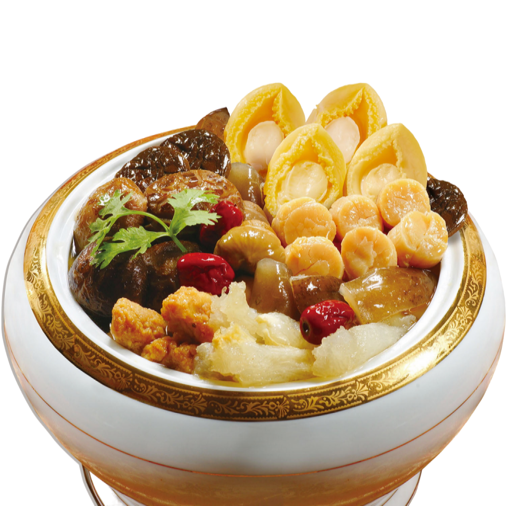 嚴選鮑魚、日本干貝、魚皮、蝦米、栗子與芋頭等多樣食材,搭配排骨與冬菇細火慢煨,湯濃料豐、層次豐富,一開鍋就知道這桌不簡單。